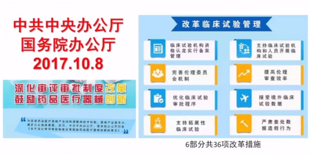2017年10月8日,為鼓勵(lì)藥品醫(yī)療器械科技創(chuàng)新,提高上市產(chǎn)品質(zhì)量和產(chǎn)業(yè)競(jìng)爭(zhēng)力,滿足公眾臨床需要,中共中央辦公廳、國(guó)務(wù)院辦公廳印發(fā)了《關(guān)于深化審評(píng)審批制度改革鼓勵(lì)藥品醫(yī)療器械創(chuàng)新的意見》。在多方面深化了審批制度,包括改革臨床試驗(yàn)管理、加快上市審評(píng)審批、促進(jìn)藥品創(chuàng)新和仿制藥發(fā)展、加強(qiáng)藥品醫(yī)療器械全生命周期管理、提升技術(shù)支撐能力、加強(qiáng)組織實(shí)施等。