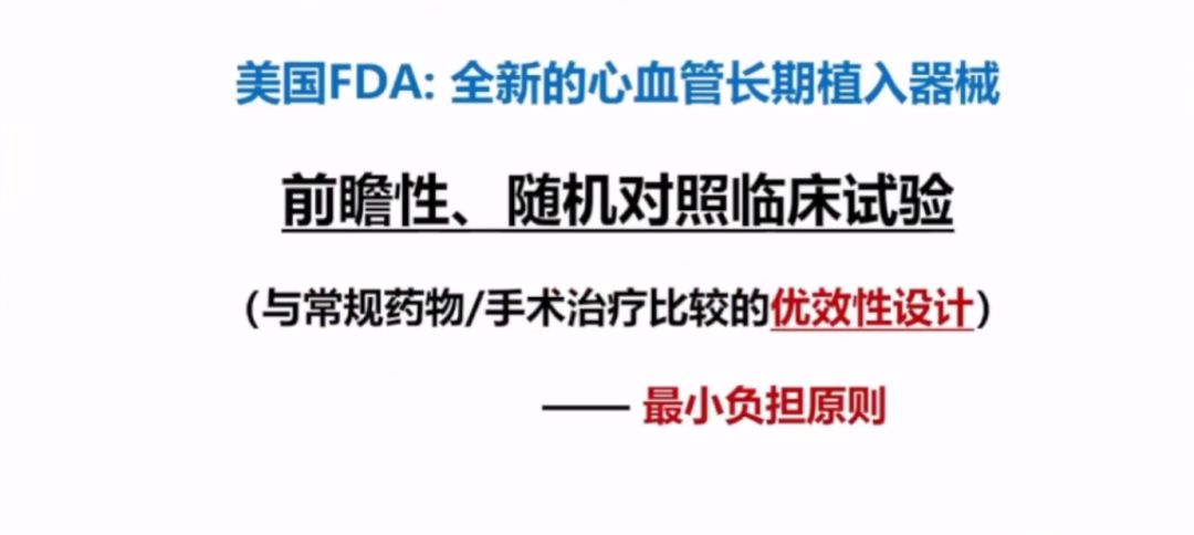 李衛(wèi)教授講到,美國(guó)FDA針對(duì)全新的心血管長(zhǎng)期植入器械,也要做前瞻性、隨機(jī)對(duì)照臨床試驗(yàn)。創(chuàng)新產(chǎn)品無同類產(chǎn)品可對(duì)照,可與常規(guī)的藥物/手術(shù)治療比較的優(yōu)效性設(shè)計(jì),也就是最小負(fù)擔(dān)原則。