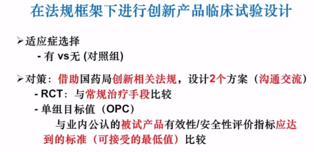 在法規(guī)框架下進(jìn)行創(chuàng)新產(chǎn)品的臨床試驗(yàn)設(shè)計(jì),李教授認(rèn)為最關(guān)鍵的是適應(yīng)癥的選擇問題(有無對(duì)照組),可設(shè)計(jì)出2個(gè)方案,以便和國(guó)家藥監(jiān)局相關(guān)部門溝通。