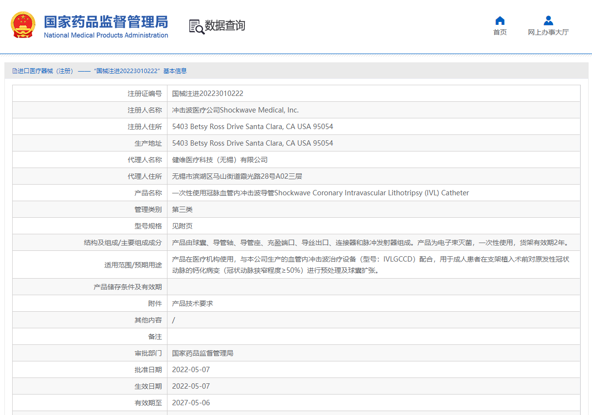 創(chuàng)新性技術(shù)正處于起步發(fā)展階段,美國ShockwaveMedical是全球第一家也是唯一一家推出沖擊波球囊的公司,目前尚無同類產(chǎn)品在我國獲準(zhǔn)注冊,產(chǎn)品已在國外投入臨床使用,并于2022年5月24日經(jīng)NMPA批準(zhǔn)上市。