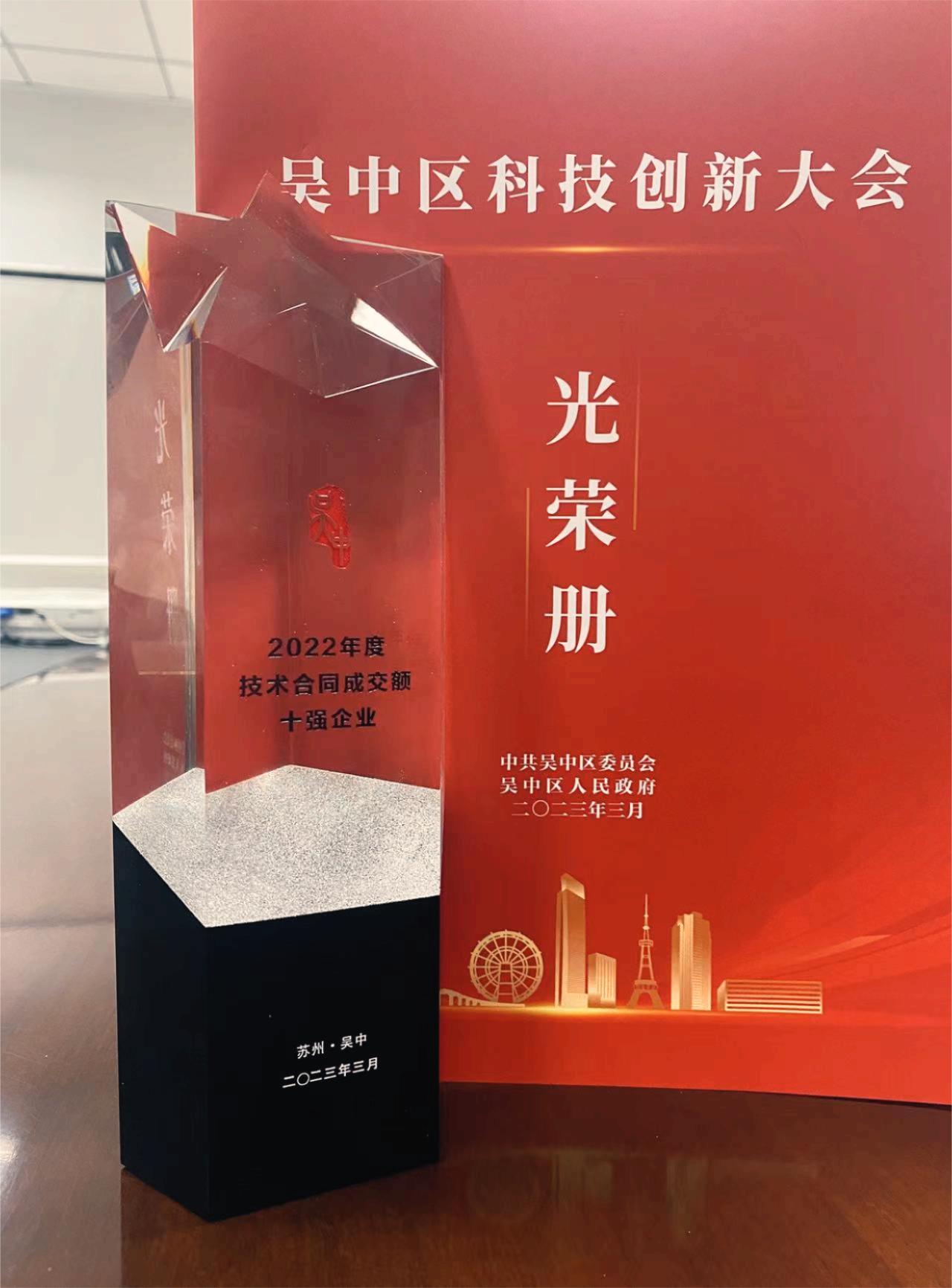 3月28日,江蘇吳中召開(kāi)全區(qū)科技創(chuàng)新大會(huì),奧泰康蘇州CDMO中心——蘇州蘇豪生物材料科技有限公司受邀出席會(huì)議,并獲得吳中區(qū)2022年度技術(shù)合同成交額十強(qiáng)企業(yè)榮譽(yù)。