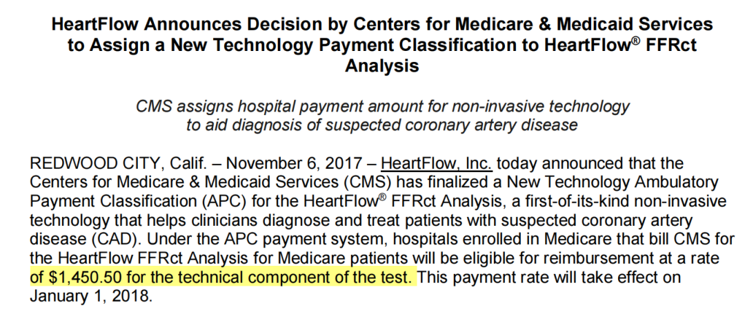 美國HeartFlow公司的FFRCT從2014年開始在歐美日韓等發(fā)達國家進行了廣泛應(yīng)用,被寫入多個臨床指南,且多個保險產(chǎn)品都可報銷相關(guān)的檢查費用,從2018年1月1日起,美國醫(yī)保報銷金額為1450.5美元/例(圖3)。
