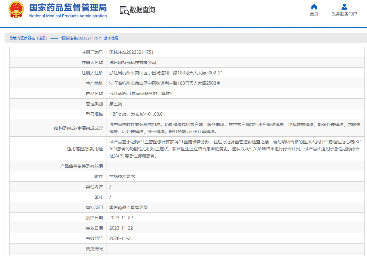 2023年11月22日,經(jīng)國家藥品監(jiān)督管理局公示,杭州阿特瑞科技有限公司研發(fā)的冠狀動脈CT血流儲備分數(shù)計算軟件(國械注準20233211751)獲得NMPA批準上市,奧泰康承擔本項目注冊申報服務(wù),系2023年奧泰康助力獲得的第17張三類醫(yī)療器械注冊證。