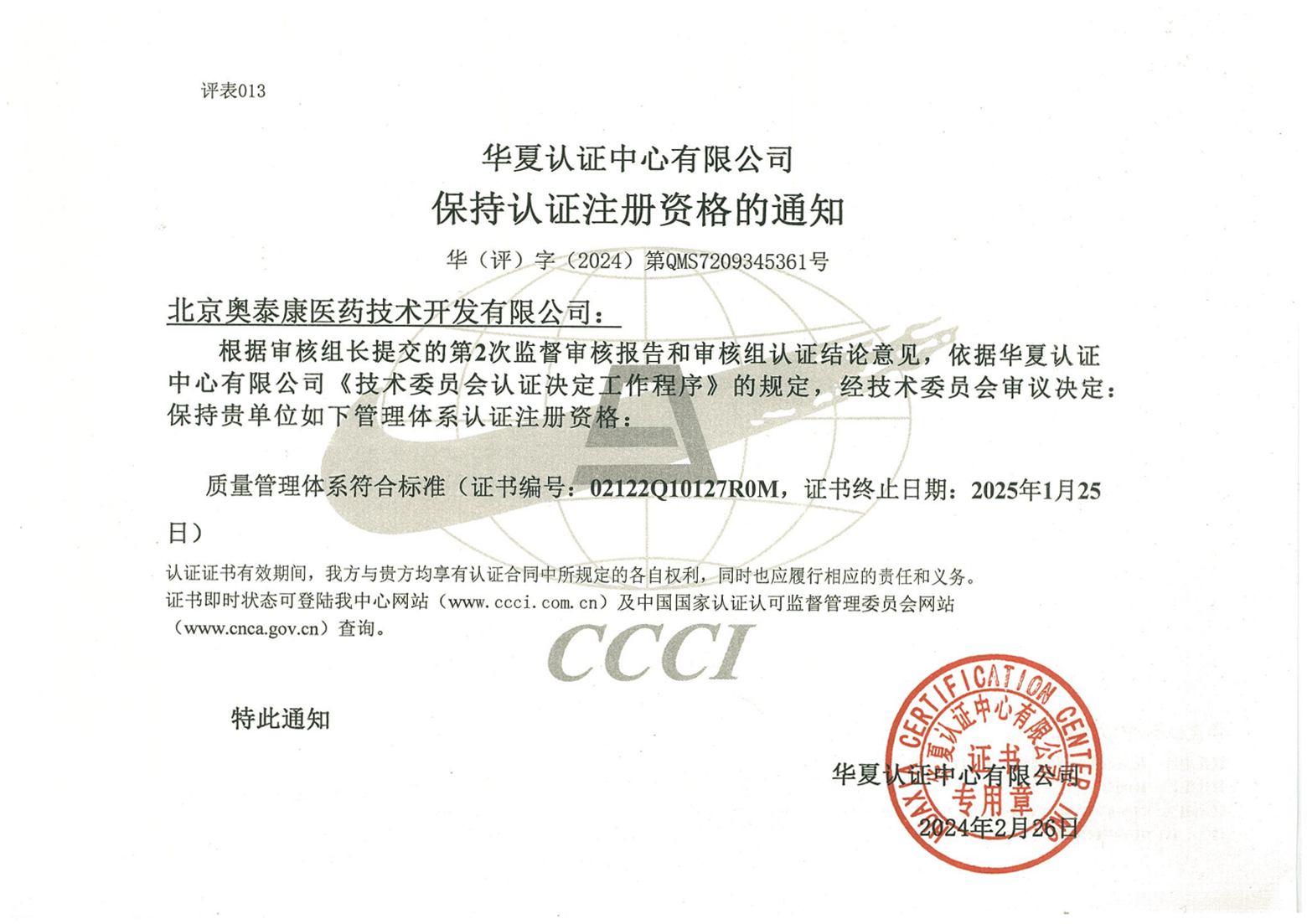 近日,北京奧泰康醫(yī)藥技術(shù)開發(fā)有限公司經(jīng)華夏認(rèn)證中心有限公司(CCCI)認(rèn)證,順利通過ISO9001:2015 標(biāo)準(zhǔn)質(zhì)量管理體系認(rèn)證年度審核,認(rèn)證范圍為醫(yī)療器械臨床試驗(yàn)及產(chǎn)品注冊服務(wù)。