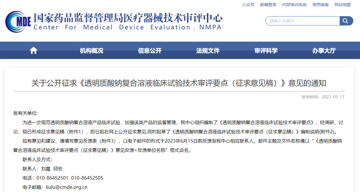 ▲ 《透明質(zhì)酸鈉復(fù)合溶液臨床試驗(yàn)技術(shù)審評(píng)要點(diǎn)(征求意見稿)》 (來源:器審中心)