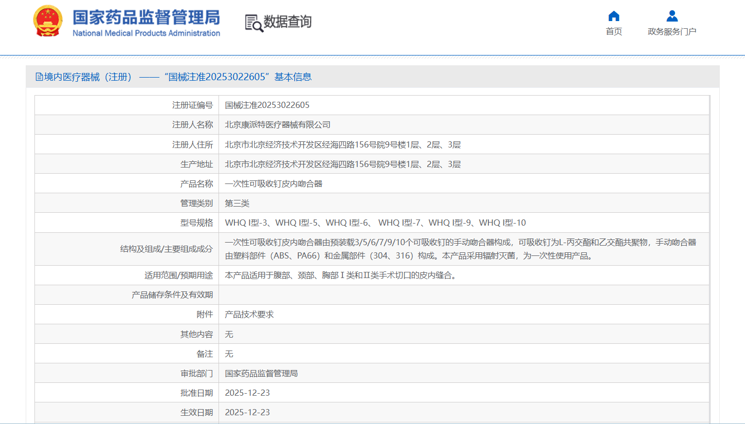 MA成果[慶祝] 奧泰康助力康派特醫(yī)療「一次性可吸收釘皮內(nèi)吻合器」獲批上市[煙花] ——系本年度助力獲得的第19張三類注冊(cè)證??近期,經(jīng)國(guó)家藥品監(jiān)督管理局公示,北京康派特醫(yī)療器械有限公司自主研發(fā)的產(chǎn)品一次性可吸收釘皮內(nèi)吻合器(國(guó)械注準(zhǔn)20253022605)獲得NMPA批準(zhǔn)上市,奧泰康提供MA解決方案。