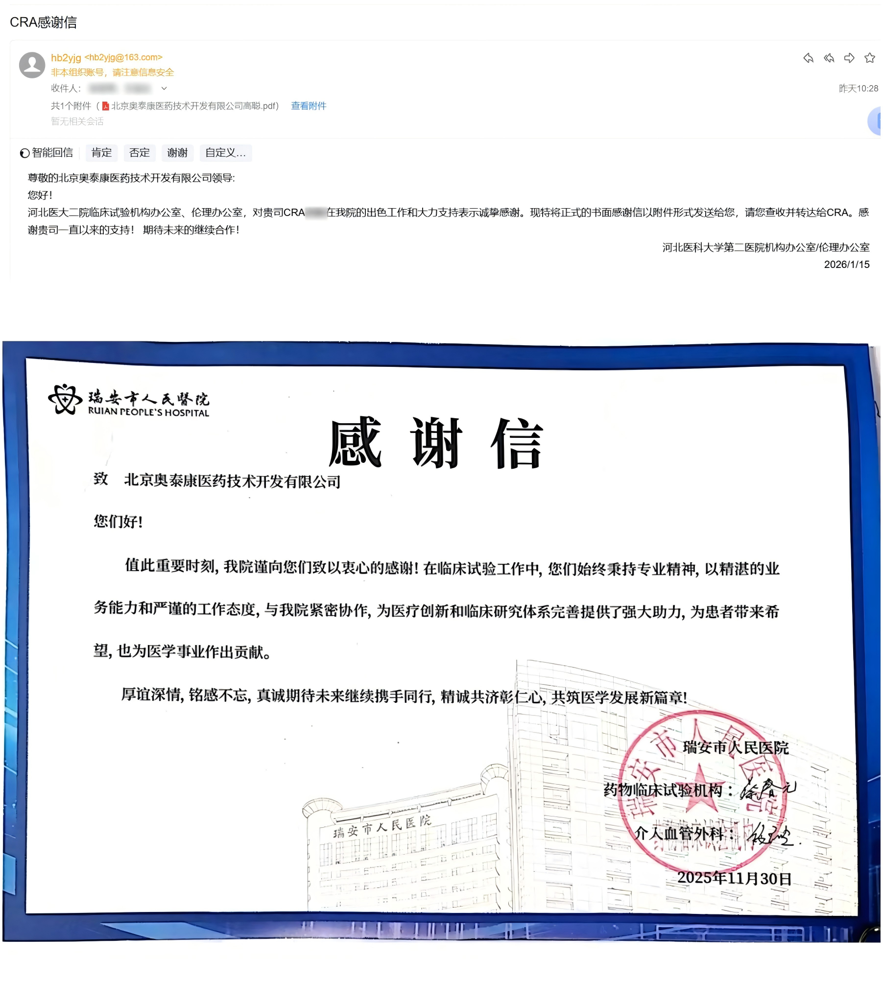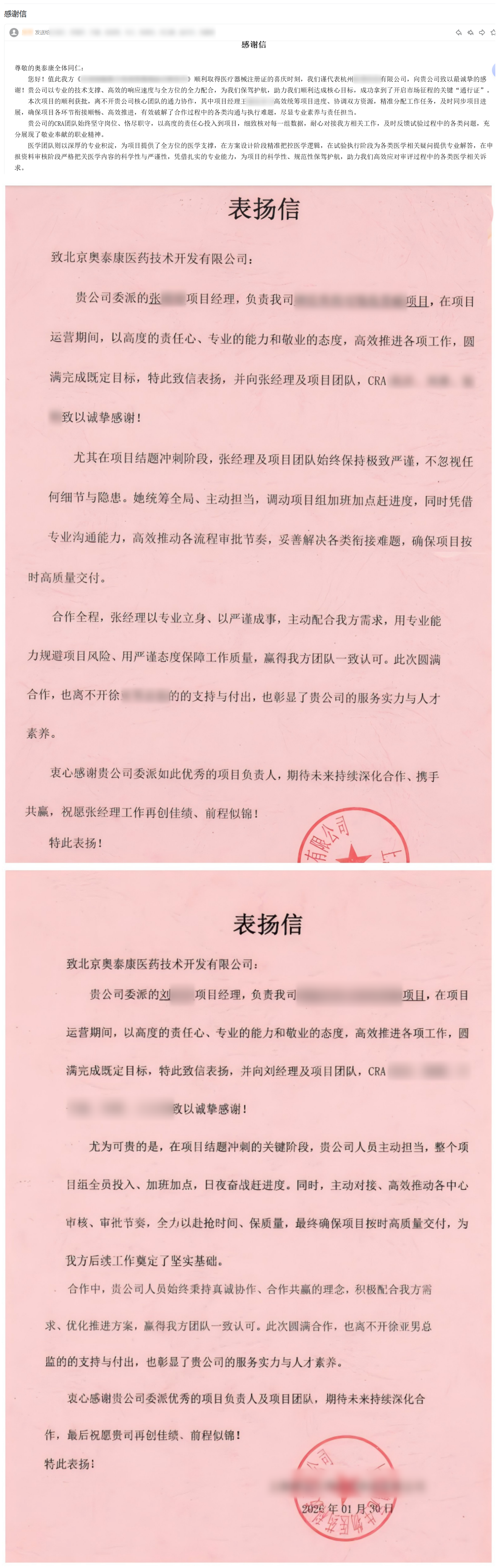 同時在賦能客戶、深耕臨床的道路上,我們始終以臨床需求為核心,把細(xì)節(jié)刻進(jìn)服務(wù)的每一個環(huán)節(jié),把責(zé)任融入工作的每一寸肌理;在臨床試驗(yàn)項(xiàng)目中,以卓越的統(tǒng)籌能力把控全局,以嚴(yán)謹(jǐn)?shù)膶I(yè)態(tài)度精益求精,以高效的執(zhí)行力度搶時間、保質(zhì)量、守承諾,全力以赴推動每一個項(xiàng)目高效落地、高質(zhì)量交付,收到了客戶的高度稱贊與認(rèn)可。每一份致謝,都彰顯著奧泰康的專業(yè)實(shí)力與服務(wù)溫度,都是對我們服務(wù)能力的最佳佐證,更是我們前行的底氣。